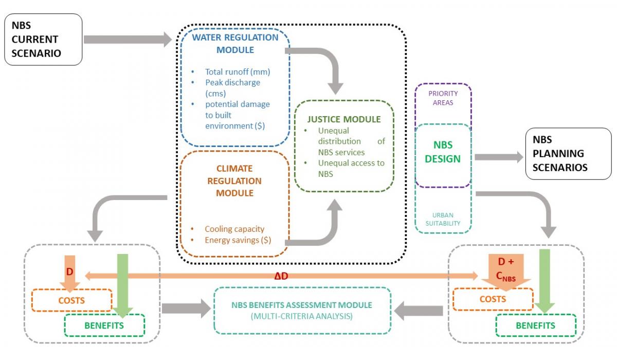 The SDSS will act as a set of models to integrate the main relevant urban issues, such as climate regulation, water regulation, lack or unequal distribution of urban functions (spatial justice), quality of urban environment, and urban regeneration. Selected NBS will be modeled in a dedicated GIS-based module of the SDSS. At the same time, a Spatial Multi-criteria Analysis in a Benefit Assessment Module will allow the evaluation of the costs and benefits produced by different NBS in a spatially explicit way and under different scenarios.